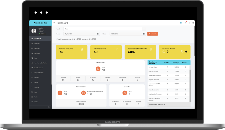 - Monitorización y análisis: La plataforma de administración ofrece una visión detallada y en línea de las interacciones del chatbot, lo que permite a los usuarios supervisar su rendimiento y obtener insights valiosos.